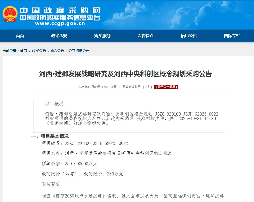 河西·建鄴發(fā)展戰(zhàn)略研究及河西中央科創(chuàng)區(qū)概念規(guī)劃采購公告發(fā)布:落實全市建設(shè)“兩城兩區(qū)兩港兩中心”創(chuàng)新樞紐戰(zhàn)略部署,高水平謀劃河西中央科創(chuàng)區(qū)。