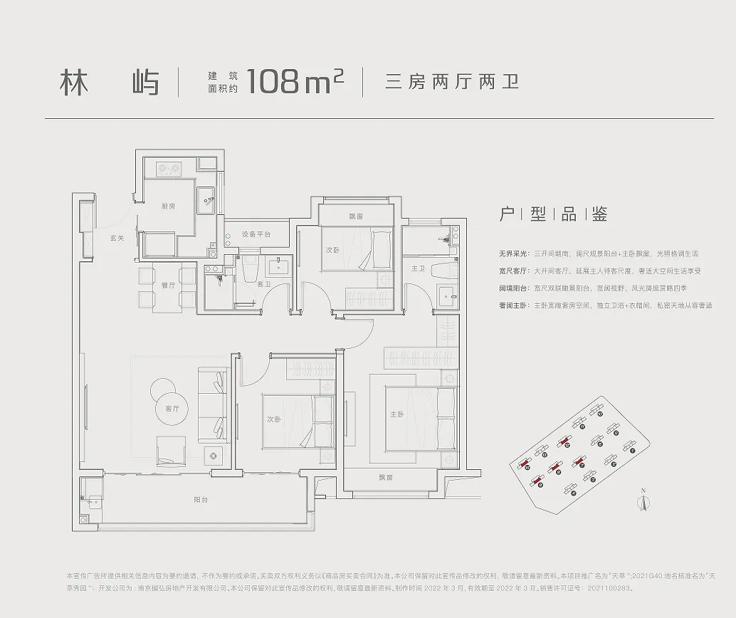 建面約108㎡三房兩廳兩衛(wèi)戶型↓