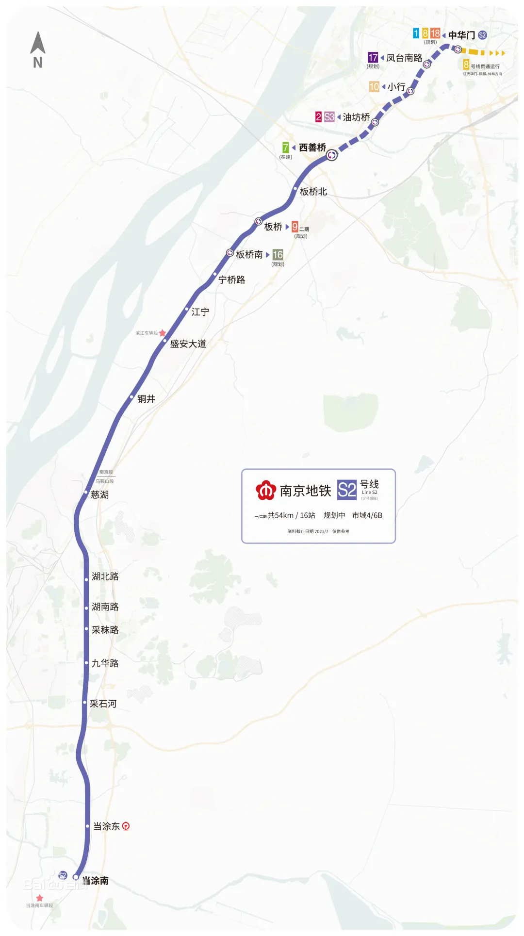 資料顯示:寧馬城際S2號線分為一期和二期兩段,一期工程起自南京市西善橋站,終點至馬鞍山市當(dāng)涂南站,其中,南京段途經(jīng)雨花臺區(qū)和江寧區(qū),長約26.51千米,共設(shè)站8座。