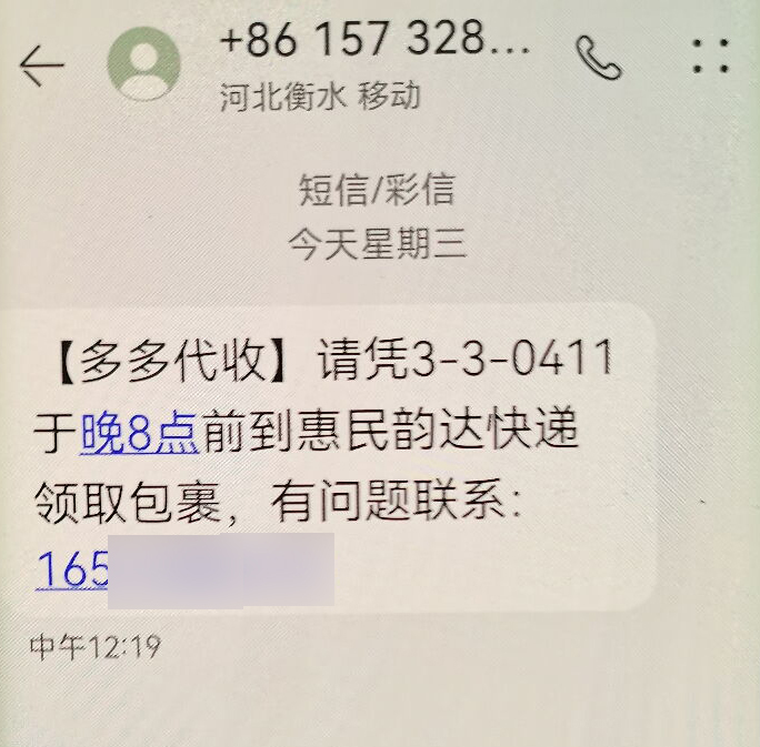 經(jīng)了解,這場(chǎng)驚心動(dòng)魄的騙局始于一條自稱快遞人員的短信。短信顯示,請(qǐng)憑取件碼于晚8點(diǎn)前領(lǐng)取包裹,并稱“有問題聯(lián)系:165****6710”。劉奶奶內(nèi)心有了疑問,顯示的取快遞點(diǎn)并非居住小區(qū)的快遞點(diǎn),于是撥打了這個(gè)手機(jī)號(hào)碼。