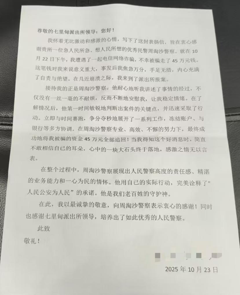 10月23日下午,劉奶奶帶著一封感謝信來到派出所,教導(dǎo)員周永濤接待了她。信中說,“這筆錢對(duì)我來說意義重大,事發(fā)后我焦急萬分,手足無措,內(nèi)心充滿了自責(zé)與絕望。在幾近崩潰之際,我來到了派出所報(bào)案……”老人紅著眼眶對(duì)派出所的幫助表示感謝。