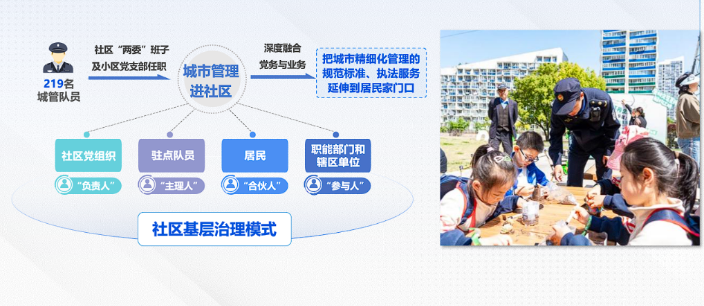 全市219名城管隊員在社區(qū)“兩委”班子及小區(qū)黨支部任職,深度融合黨務(wù)與業(yè)務(wù),把城市精細(xì)化管理的規(guī)范標(biāo)準(zhǔn)、執(zhí)法服務(wù)延伸到居民家門口,形成了社區(qū)黨組織為“負(fù)責(zé)人”、駐點隊員為“主理人”、居民為“合伙人”、職能部門和轄區(qū)單位為“參與人”的社區(qū)基層治理模式。