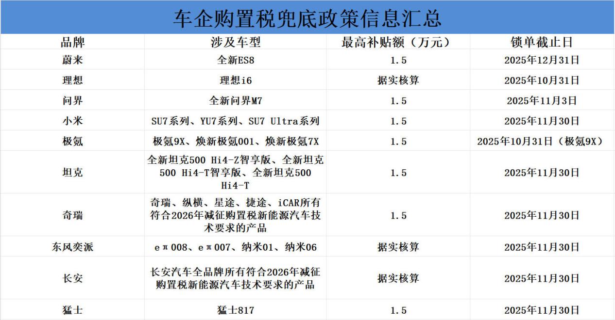 新能源汽車購置稅免征政策將在12月31日終止,自2026年1月1日起政策變?yōu)橘徶枚悳p半征收。蔚來、問界、奇瑞汽車等車企紛紛宣布“自掏腰包”兜底,一場圍繞補貼最后窗口期的訂單搶奪賽開啟。下面,就對推出兜底政策的企業(yè)進行盤點。