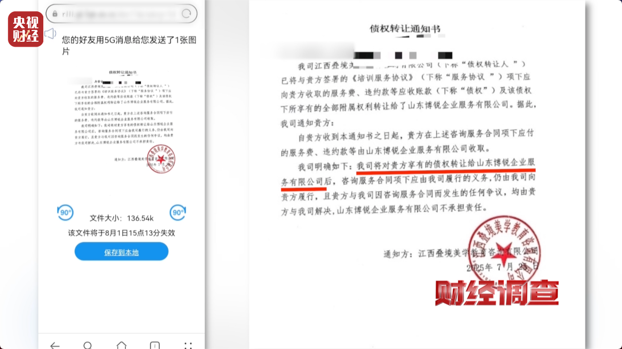 就在記者對(duì)學(xué)易付公司進(jìn)行調(diào)查的同時(shí),有在這場(chǎng)兼職轉(zhuǎn)培訓(xùn)生意里上當(dāng)?shù)膶W(xué)員,給記者發(fā)來(lái)消息,目前,這家公司已經(jīng)將逾期沒(méi)有交的學(xué)費(fèi),作為“債權(quán)”轉(zhuǎn)讓給了山東博銳企業(yè)服務(wù)有限公司。