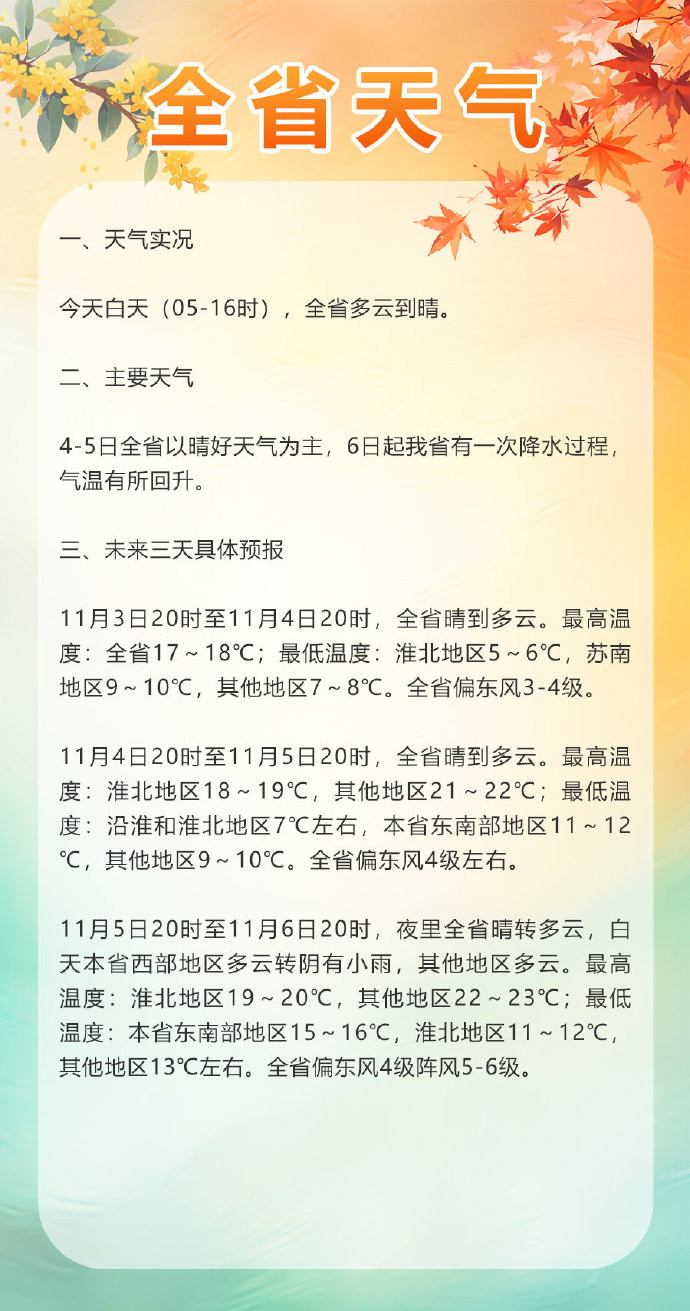 具體來看未來幾日天氣,11月3日20時(shí)至4日20時(shí),全省晴到多云,最高溫度17—18℃,最低溫度淮北地區(qū)5—6℃,蘇南地區(qū)9—10℃,其他地區(qū)7—8℃,偏東風(fēng)3—4級(jí);4日20時(shí)至5日20時(shí),全省仍為晴到多云,氣溫小幅回升,淮北地區(qū)最高18—19℃,其他地區(qū)可達(dá)21—22℃,最低溫度沿淮和淮北地區(qū)7℃左右,東南部地區(qū)11—12℃,其他地區(qū)9—10℃,偏東風(fēng)4級(jí)左右;5日20時(shí)至6日20時(shí),白天西部地區(qū)多云轉(zhuǎn)陰有小雨,其他地區(qū)多云,最高溫度淮北地區(qū)19—20℃,其他地區(qū)22—23℃,最低溫度東南部地區(qū)15—16℃,淮北地區(qū)11—12℃,其他地區(qū)13℃左右,偏東風(fēng)4級(jí)陣風(fēng)5—6級(jí)。