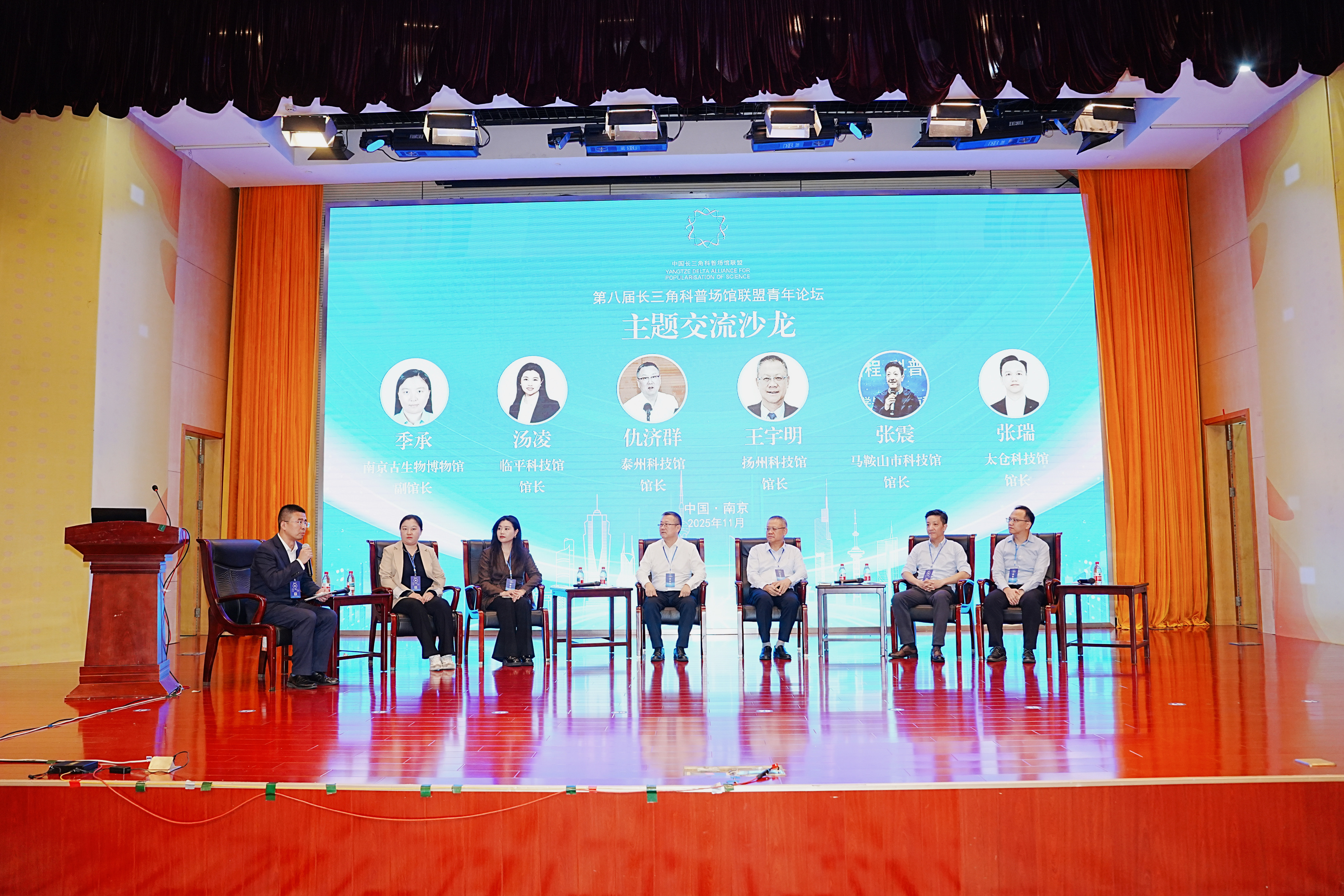 隨后的主題交流沙龍由南京科技館副館長孫強主持,邀請到泰州科技館館長仇濟群、揚州科技館館長王宇明、馬鞍山市科技館館長張震、臨平科技館館長湯凌、太倉科技館館長張瑞、南京古生物博物館副館長季承6位館長,圍繞“面向‘十五五’的科普場館革新、技術(shù)賦能和區(qū)域一體化發(fā)展”這一主題展開研討。館長們聚焦生成式AI、元宇宙等技術(shù)驅(qū)動下的內(nèi)容生產(chǎn)與虛實融合體驗升級,探索區(qū)域一體化協(xié)同機制,推動資源共享與品牌聯(lián)動。針對技術(shù)路線選擇、跨界資源整合、復合型人才培養(yǎng)等痛點,與會者提出構(gòu)建“公益+商業(yè)”平衡生態(tài),通過館校企協(xié)作降低研發(fā)成本,借力政策優(yōu)化文商旅融合路徑,為科普場館可持續(xù)發(fā)展和公共價值提升提供系統(tǒng)性解決方案?,F(xiàn)場氣氛活躍,嘉賓暢所欲言,碰撞出許多思想的火花,為科普場館面向“十五五”可持續(xù)發(fā)展提供了許多啟發(fā)。