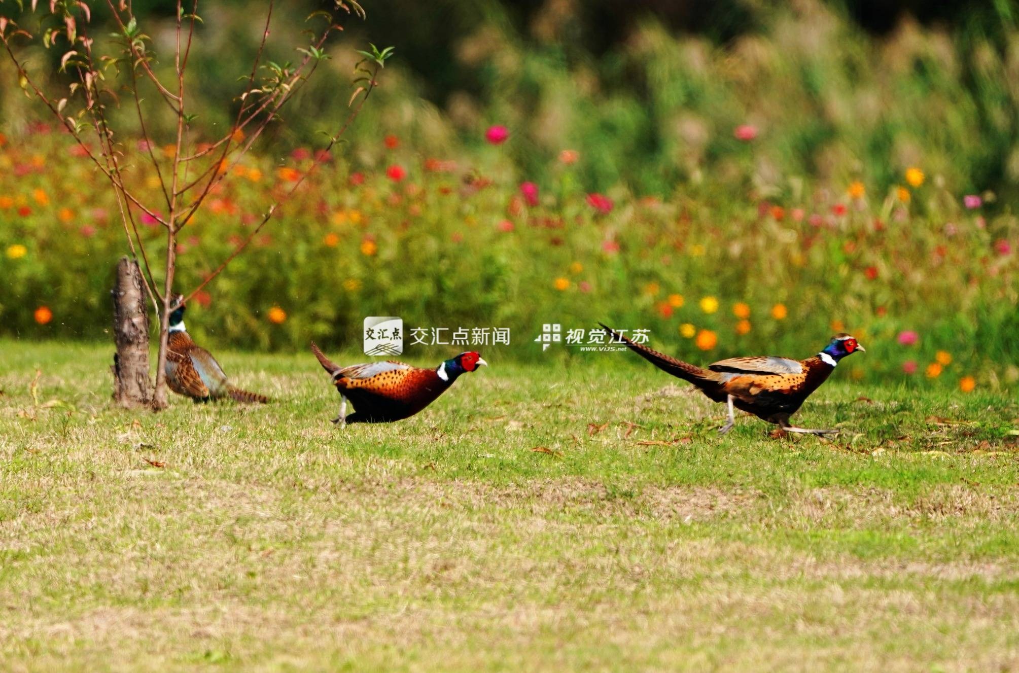 (特約攝影 武家敏 12:14攝 13:06上線)11月4日,在南京江心洲的金雞菊花草叢中,數(shù)只羽色艷麗的 “貴賓”——雉雞棲息此地。