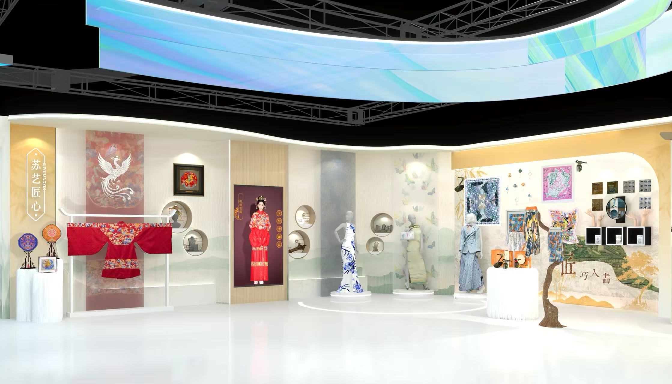 走進第八屆進博會江蘇人文交流展區(qū),378平方米的空間里,“江潮疊韻”的設(shè)計理念撲面而來——流動起伏的曲線模擬江河奔涌,動態(tài)光影營造波光粼粼的效果,呼應(yīng)著江蘇“江河湖?!钡淖匀环A賦,也象征著這片土地創(chuàng)新突破的活力。這里不再是傳統(tǒng)的“展品陳列室”,而是一座“古今交融、虛實共生”的文化體驗館,用小展臺呈現(xiàn)大人文。