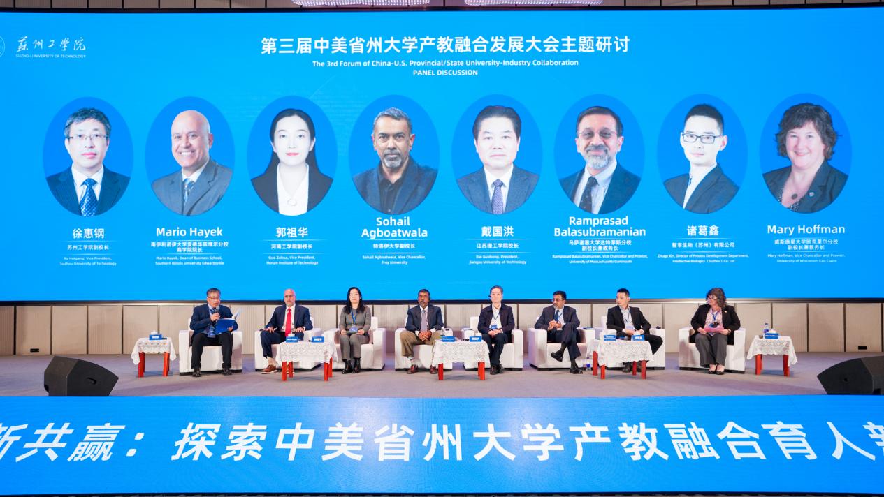 在主題研討中,江蘇理工學院校長戴國洪、河南工學院副校長郭祖華、詹姆斯麥迪遜大學校長詹姆斯?施密德、馬薩諸塞大學達特茅斯分校副校長兼教務(wù)長蘭普拉薩德?巴拉蘇布拉馬尼亞恩、特洛伊大學副校長蘇海爾?阿格博瓦拉、南伊利諾伊大學愛德華茲維爾分校商學院院長馬里奧?哈耶克、智享生物(蘇州)有限公司工藝開發(fā)部總監(jiān)/董事諸葛鑫,圍繞中美高校攜手產(chǎn)業(yè)共建可持續(xù)發(fā)展的產(chǎn)教融合生態(tài)體系、以國際產(chǎn)業(yè)學院為載體打造中美科創(chuàng)聯(lián)合體、建立合作質(zhì)量評估體系保障中美產(chǎn)教融合可持續(xù)發(fā)展等主題開展深入研討并達成一致。