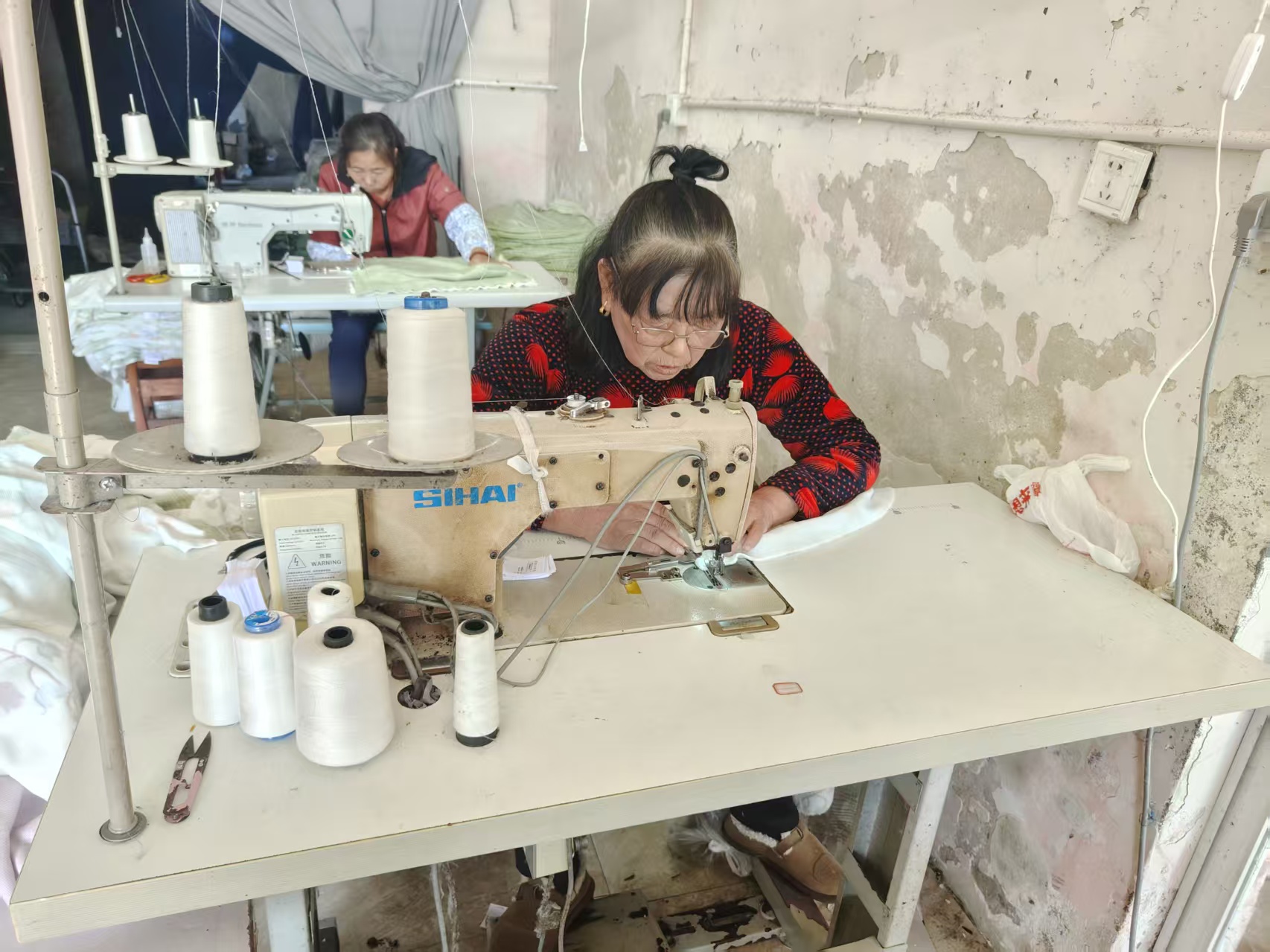 在顧灶村的手工加工點(diǎn),“嗡嗡”的縫紉機(jī)聲匯成了一首動(dòng)聽(tīng)的“致富曲”。六名工人手腳麻利地推送著布片,飛速移動(dòng)的針腳下,一個(gè)個(gè)枕頭套逐漸成型。