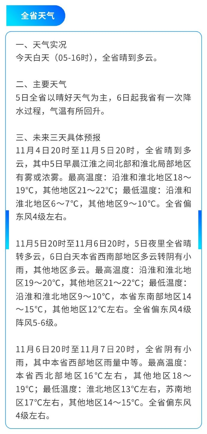 11月4日20時至11月5日20時,全省晴到多云,其中5日早晨,江淮之間北部和淮北局部地區(qū)有霧或濃霧。最高溫度:沿淮和淮北地區(qū)18~19℃,其他地區(qū)21~22℃;最低溫度:沿淮和淮北地區(qū)6~7℃,其他地區(qū)9~10℃。全省偏東風4級左右。