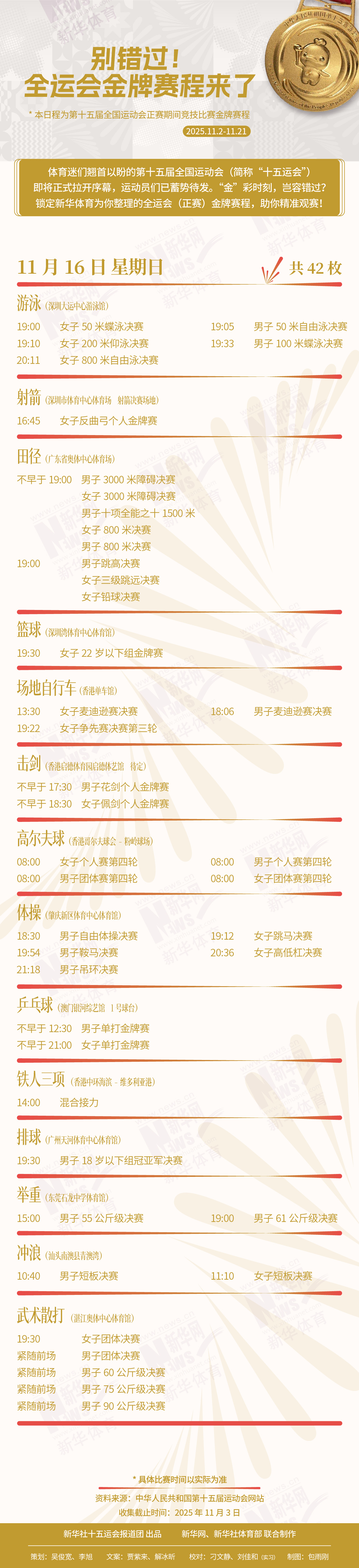 體育迷們翹首以盼的第十五屆全國運(yùn)動(dòng)會(huì)(簡(jiǎn)稱“十五運(yùn)會(huì)”)即將正式拉開序幕,運(yùn)動(dòng)員們已蓄勢(shì)待發(fā)。“金”彩時(shí)刻,豈容錯(cuò)過?鎖定新華體育為你整理的全運(yùn)會(huì)(正賽)金牌賽程,助你精準(zhǔn)觀賽!