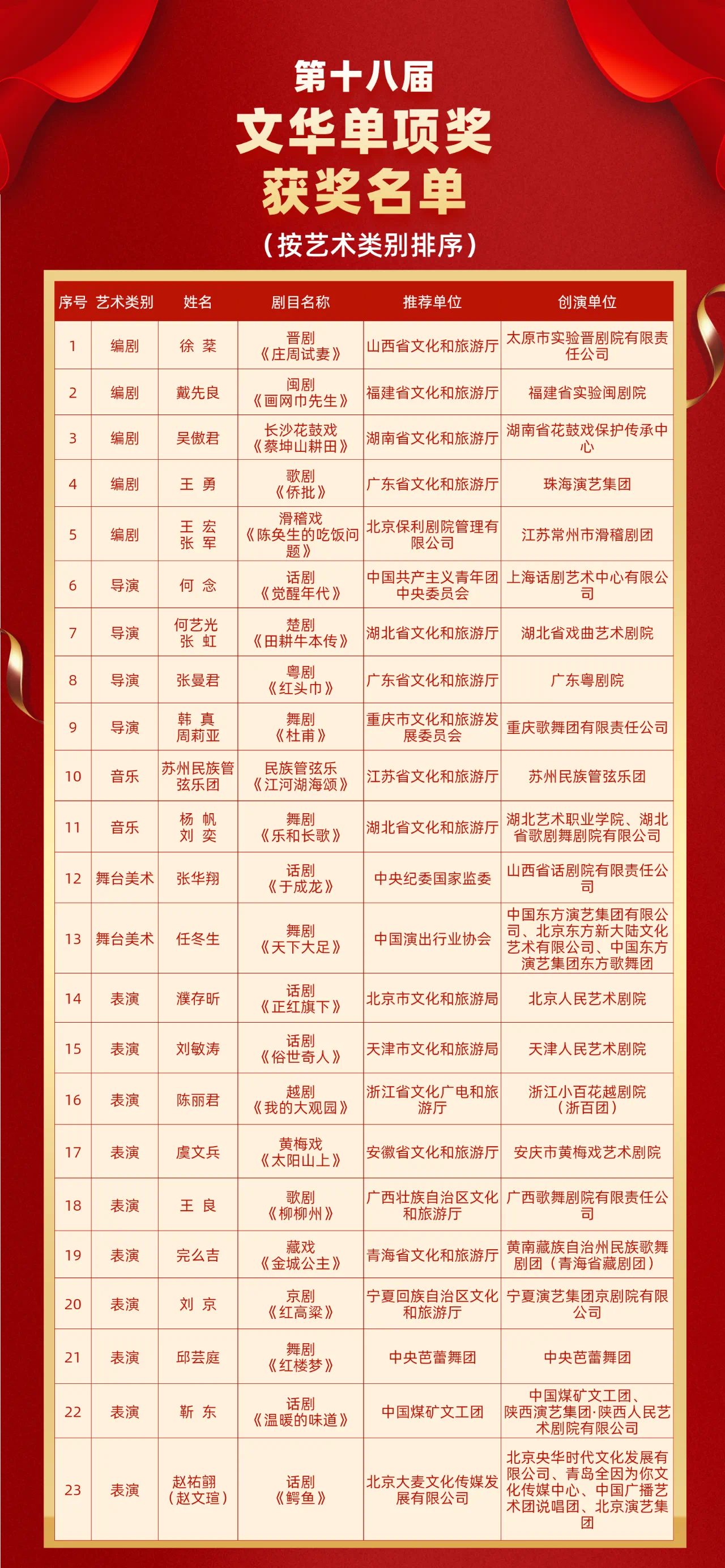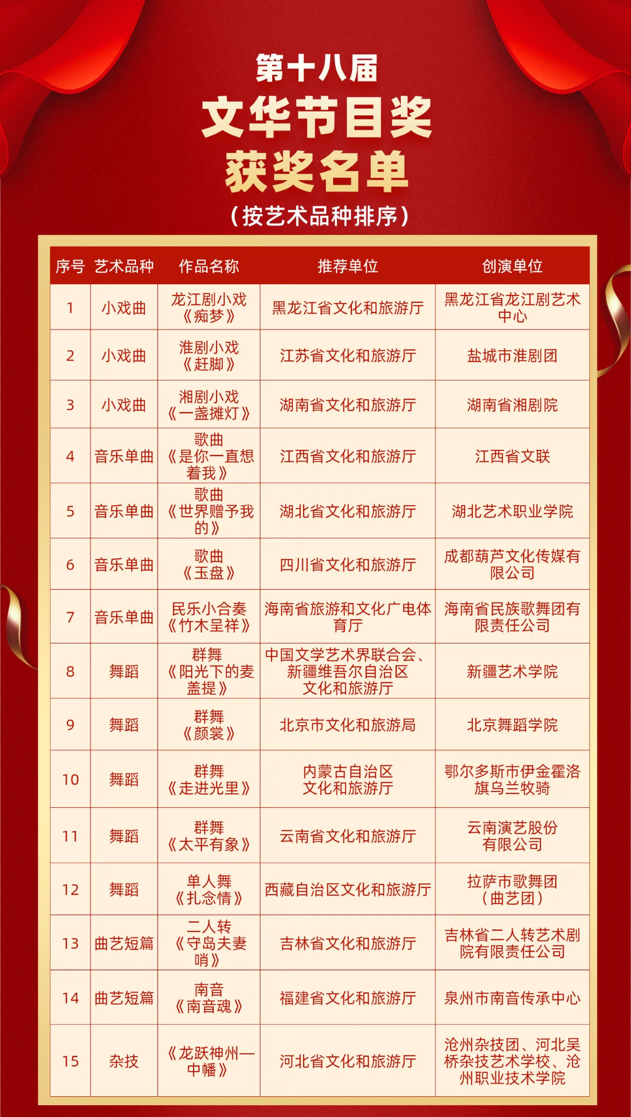 本屆文華獎,總計頒發(fā)53個文華獎項,其中江蘇獨攬5項,獲獎總數(shù)位列全國第一。尤其在競爭最為激烈的15部“文華劇目獎”中,江蘇占據(jù)2席,不僅實現(xiàn)了江蘇文華獎“五連冠”,而且在獲獎數(shù)量上取得歷史性新突破。
